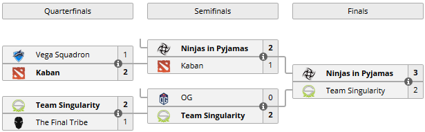 16:00 The Final Tribe 1:2 Team Singularity19:00 Natus Vincere 0:2 Team Empire / полуфинал Востока22:00 Ninjas in Pyjamas 2:1 Kaban / полуфинал Запада