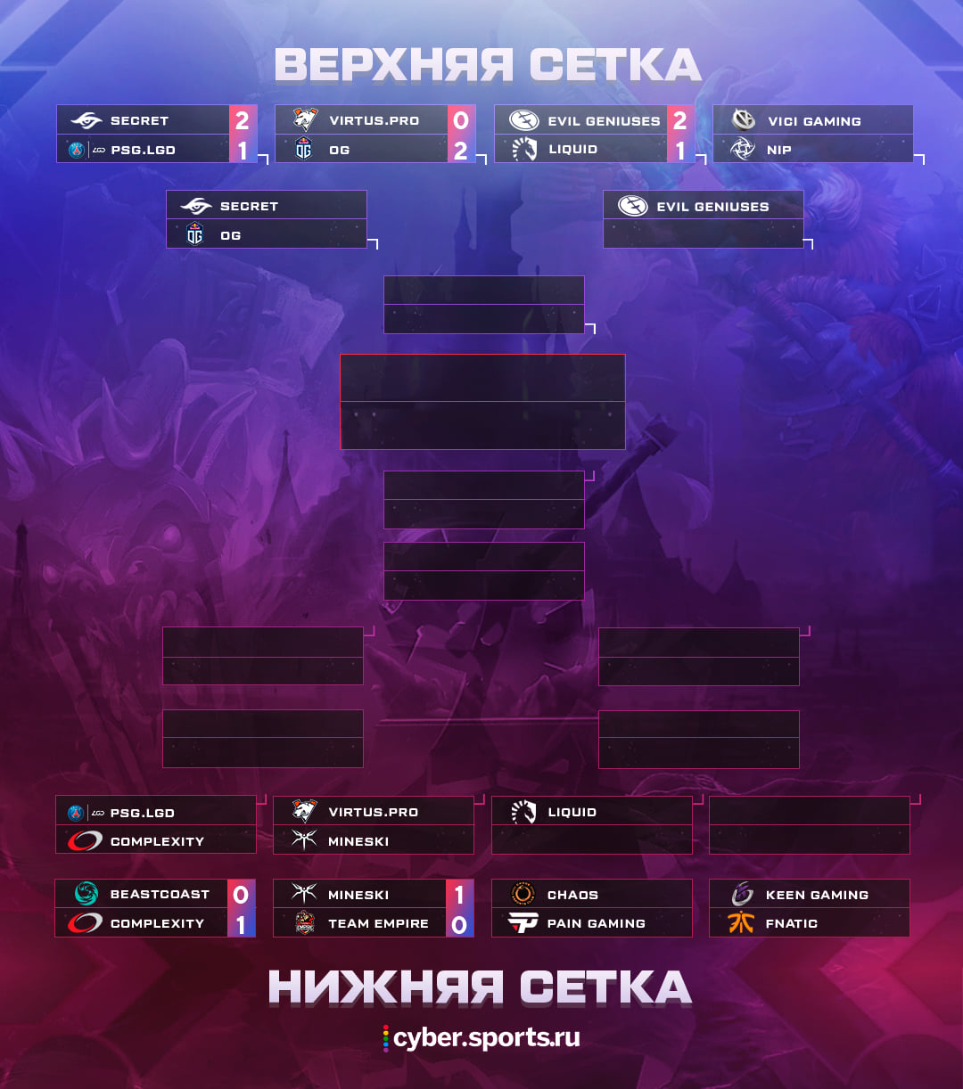 Evil Geniuses встретятся с победителем матча Vici Gaming – Ninjas in Pyjamas, Team Liquid сразится с составом, который выиграет матч Chaos – Pain.