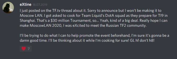 «Жаль, но я не смогу приехать на Moscow LAN. Меня попросили поработать на буткемпе Team Liquid в Шанхае перед The International 2019. Турнир на 30 млн долларов, так что это большое дело. Я действительно надеюсь, что смогу посетить Moscow LAN 2020. Я с нетерпением ждал встречи с российским сообществом Team Fortress 2. Постараюсь сделать все возможное для продвижения турнира, уверен, это будет чертовски хорошим времяпрепровождением. Буду думать о турнире во время приготовления еды!» – написал eXtine.