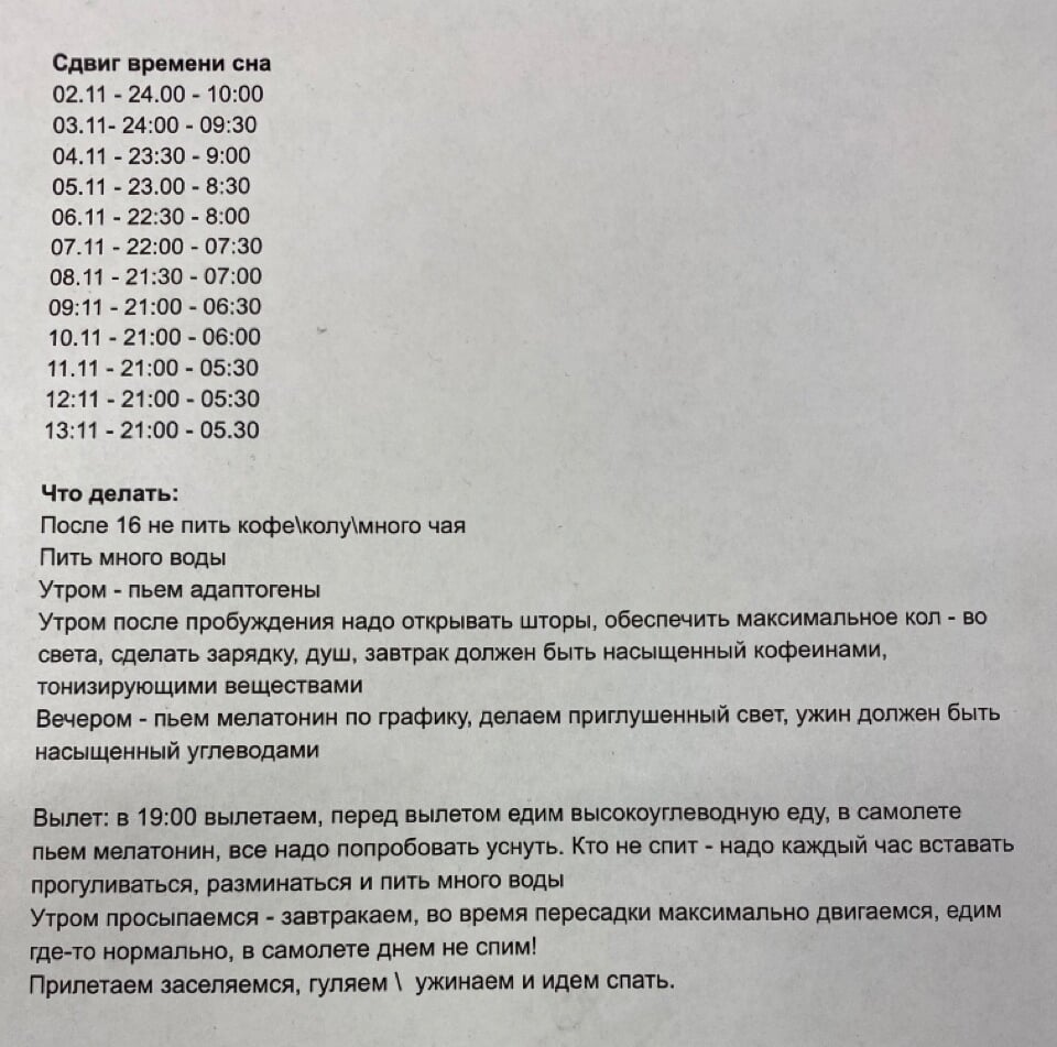 Для игроков команды было подготовлено расписание сна, а также рекомендации по приему пищи. В инструкции также есть рекомендации о том, как готовиться к перелету в Китай.