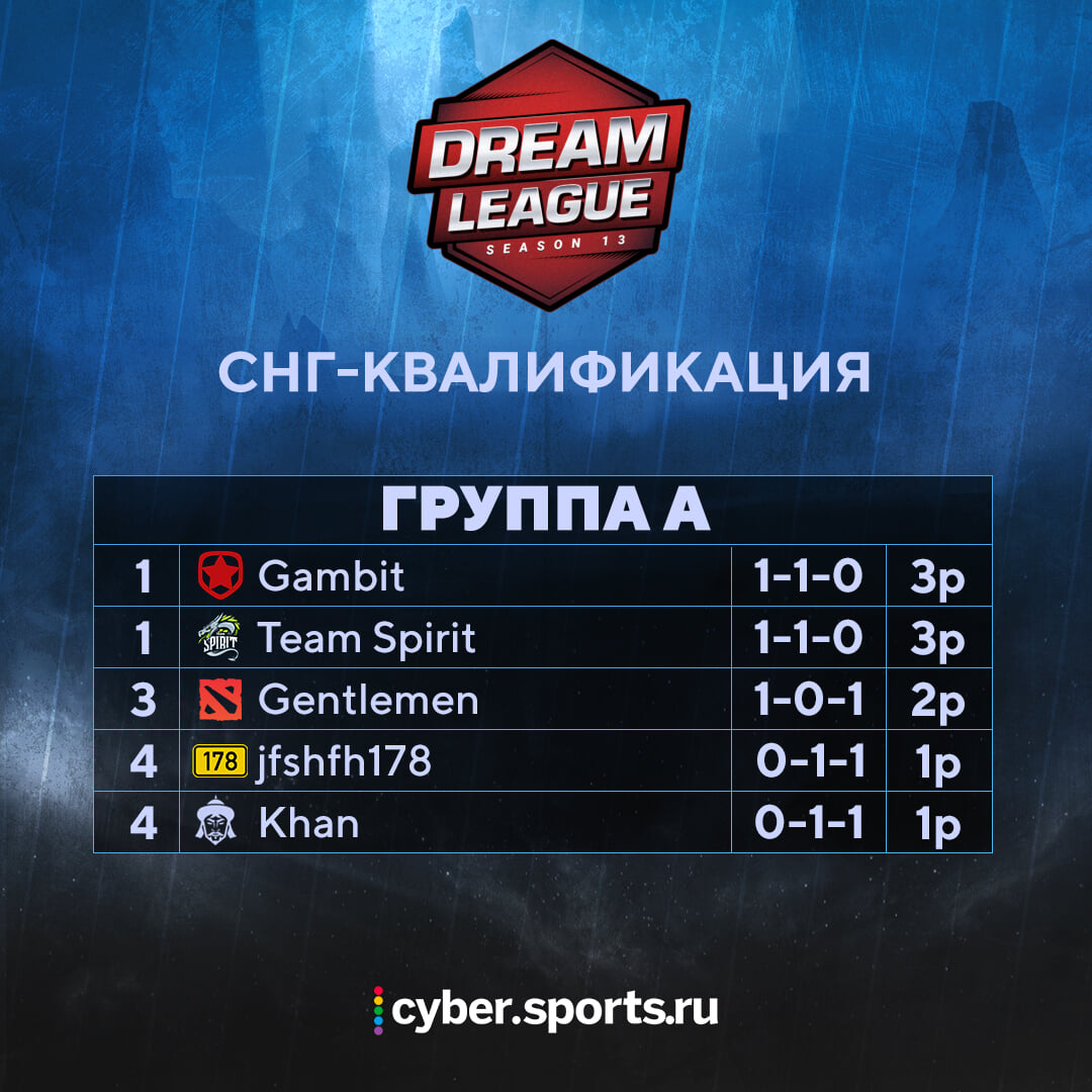 12:00 Gambit 1:1 Team Spirit14:00 jfshfh178 0:2 Gentlemen16:00 Team Spirit 2:0 Khan18:00 Gambit 2:0 Gentlemen20:00 jfshfh178 1:1 Khan