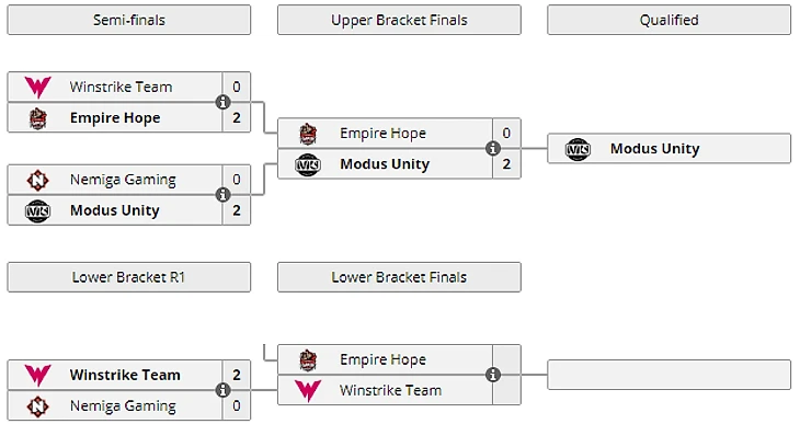 12:00 Winstrike 0:2 Empire.Hope15:00 Nemiga 0:2 Modus Unity18:00 Empire Hope 0:2 Modus Unity / финал верхней сетки