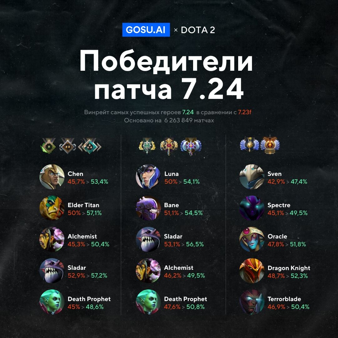 GOSU.AI сравнил винрейт лучших героев патча 7.24 по доле побед с патчем 7.23f.