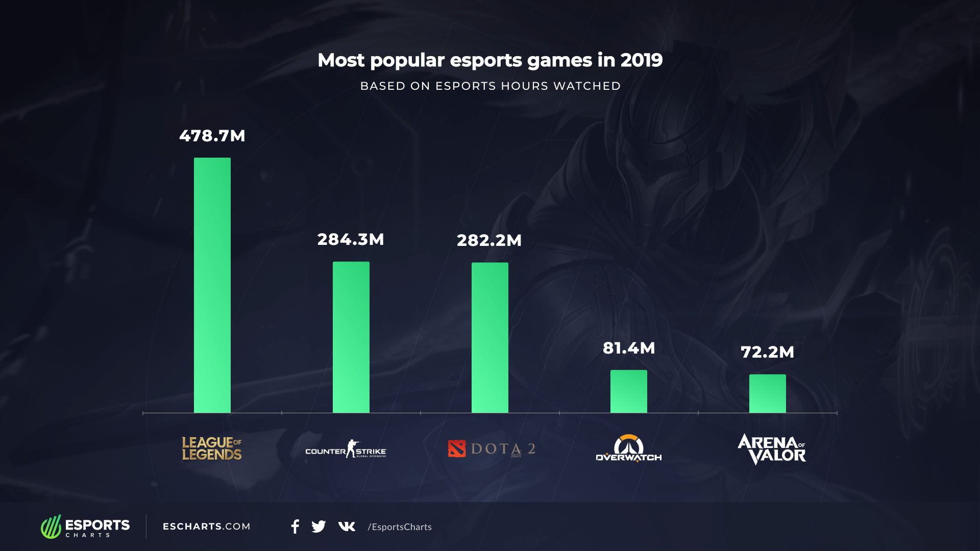 1. League of Legends – 478 млн часов просмотров2. CS:GO – 284 млн часов просмотров3. Dota 2 – 282 млн часов просмотров4. Overwatch – 81 млн часов просмотров5. Arena of Valor – 72 млн часов просмотров