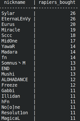 Больше всех рапиры покупали Лю «Sylar» Цзяцзюнь и Джеки «EternaLEnVy» Мао – по 26. Амер «Miracle-» аль-Баркави занял 4-е место с 19 покупками. Первый игрок из СНГ – Ростислав «Fn» Лозовой – занял 9-е место.