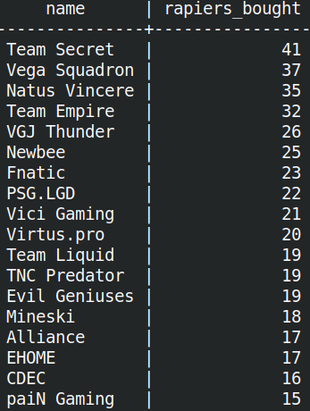 За этот период времени наибольшее число рапир – 41 – приобрели игроки Team Secret. Следом идут три команды из СНГ: Vega Squadron с 37 купленными рапирами, NAVI с 35 покупками и Empire с 32 рапирами. Пятерку замыкает VGJ Thunder (26 рапир). Virtus.pro с 20 покупками рапир занимает 10-е место.