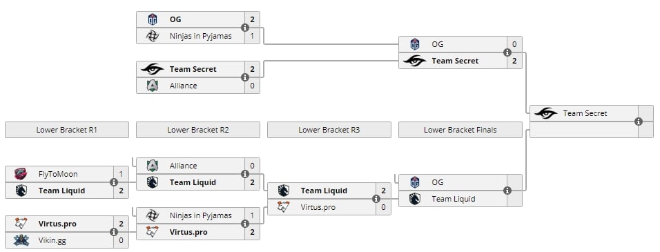 12:00 OG 2:1 NiP / первый раунд верхней сетки15:00 Secret 2:0 Alliance / первый раунд верхней сетки18:00 FlyToMoon 1:2 Liquid / первый раунд нижней сетки21:00 Virtus.pro 2:0 Vikin.gg / первый раунд нижней сетки