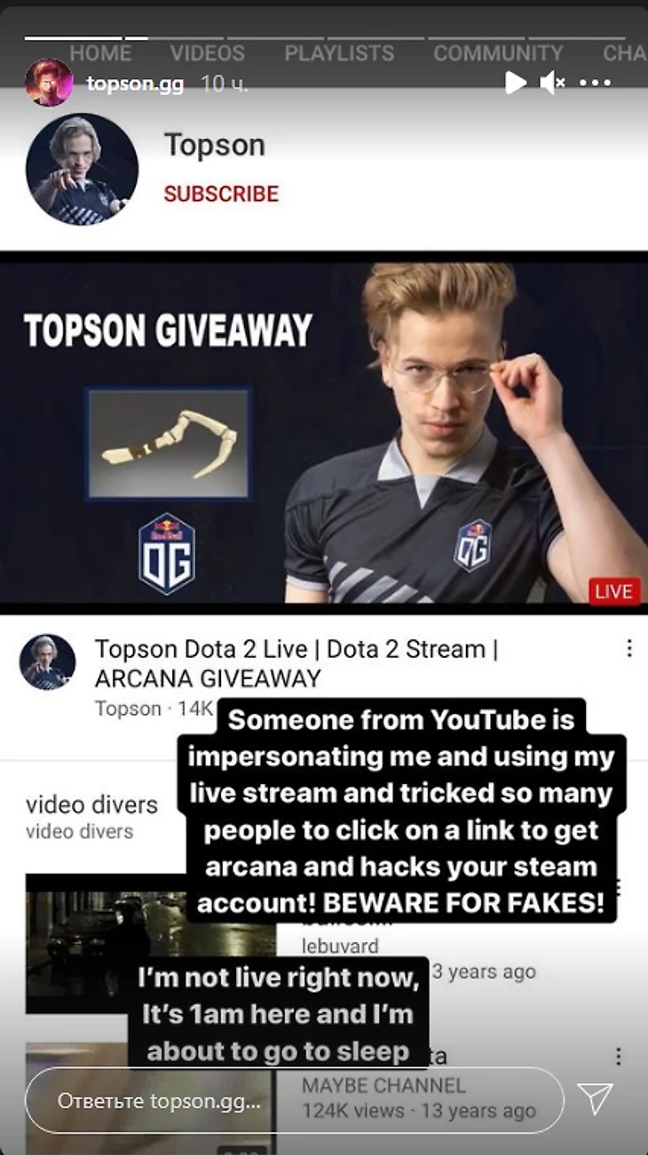 Мидер OG Топиас «Topson» Таавитсайнен в инстаграме рассказал о фейковом стриме, который злоумышленник проводит под именем игрока.