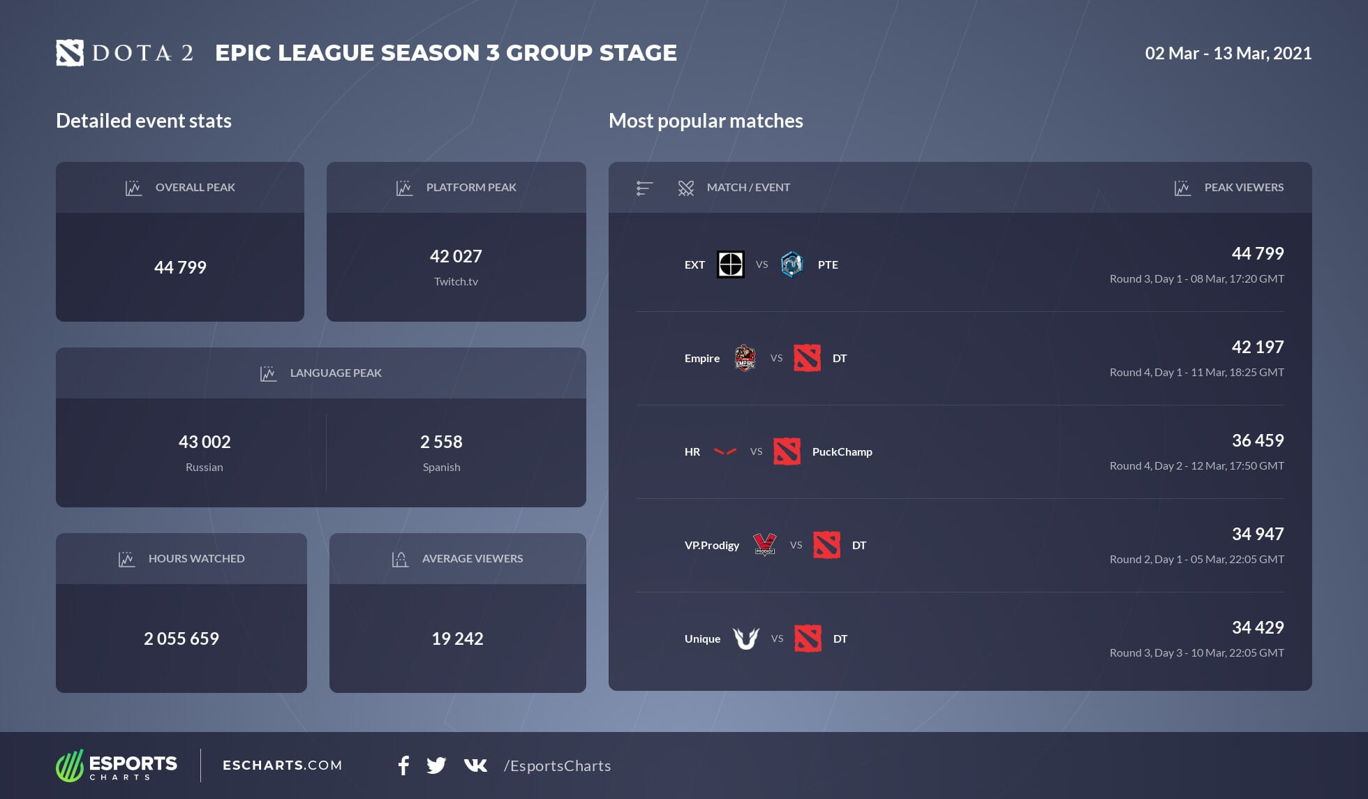 Самым популярной стала встреча между EXTREMUM и Prosti Esli – в пик она собрала на трансляции 44799 человек. Также в тройке оказались матчи Empire – Dota Team (42197 зрителей) и HellRaisers – PuckChamp (36159).