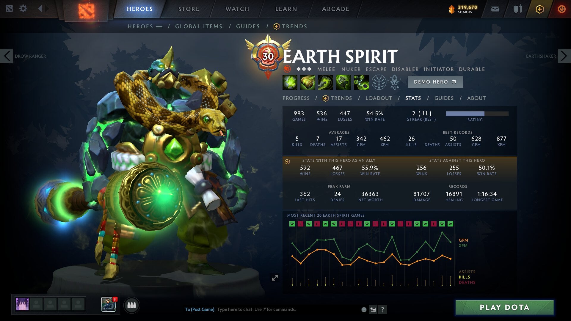 На Earth Spirit Cr1t провел 983 игры: 536 матчей он выиграл, а 447 встреч на Земляном Духе закончились для Крита поражением. Лучший победный стрик на ES составляет 11 матчей.