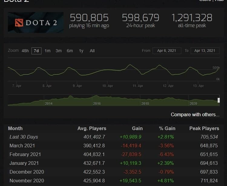 Этот показатель стал наибольшим за последние шесть месяцев: в ноябре 2020-го в Доту одновременно играло 711 тысяч человек. После этого каждый месяц пиковый показатель игроков в игре неизменно падал, даже не смотря на выход декабрьского патча 7.28.