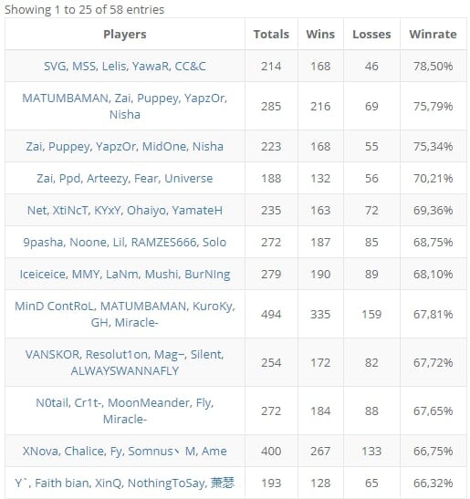 Quincy Crew провела 214 матчей, из которых выиграла 168. Процент побед клуба составляет 78,5%. Представитель североамериканского дивизиона по этому показателю обошел Team Secret – 75,79% побед (285 матчей). Тройку лидеров также занимает Team Secret с Мидваном в составе – 75,34% побед (223 матча).