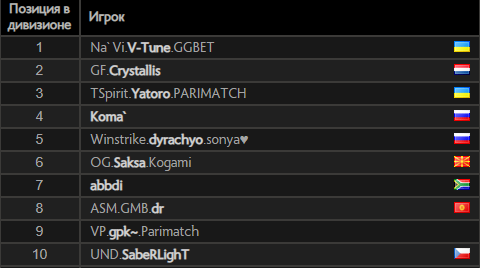 На первой строчке рейтинга оказался Алик «V-Tune» Воробей из NAVI, также в тройку вошли игрок Ghost Frogs Ремко «Crystallis» Аретс и керри Spirit Илья «Yatoro» Мулярчук. В пятерке оказались и Камиль «Agressive child» Биктимиров из Cyberium вместе с керри Winstrike Антоном «Dyrachyo» Шкредовым.