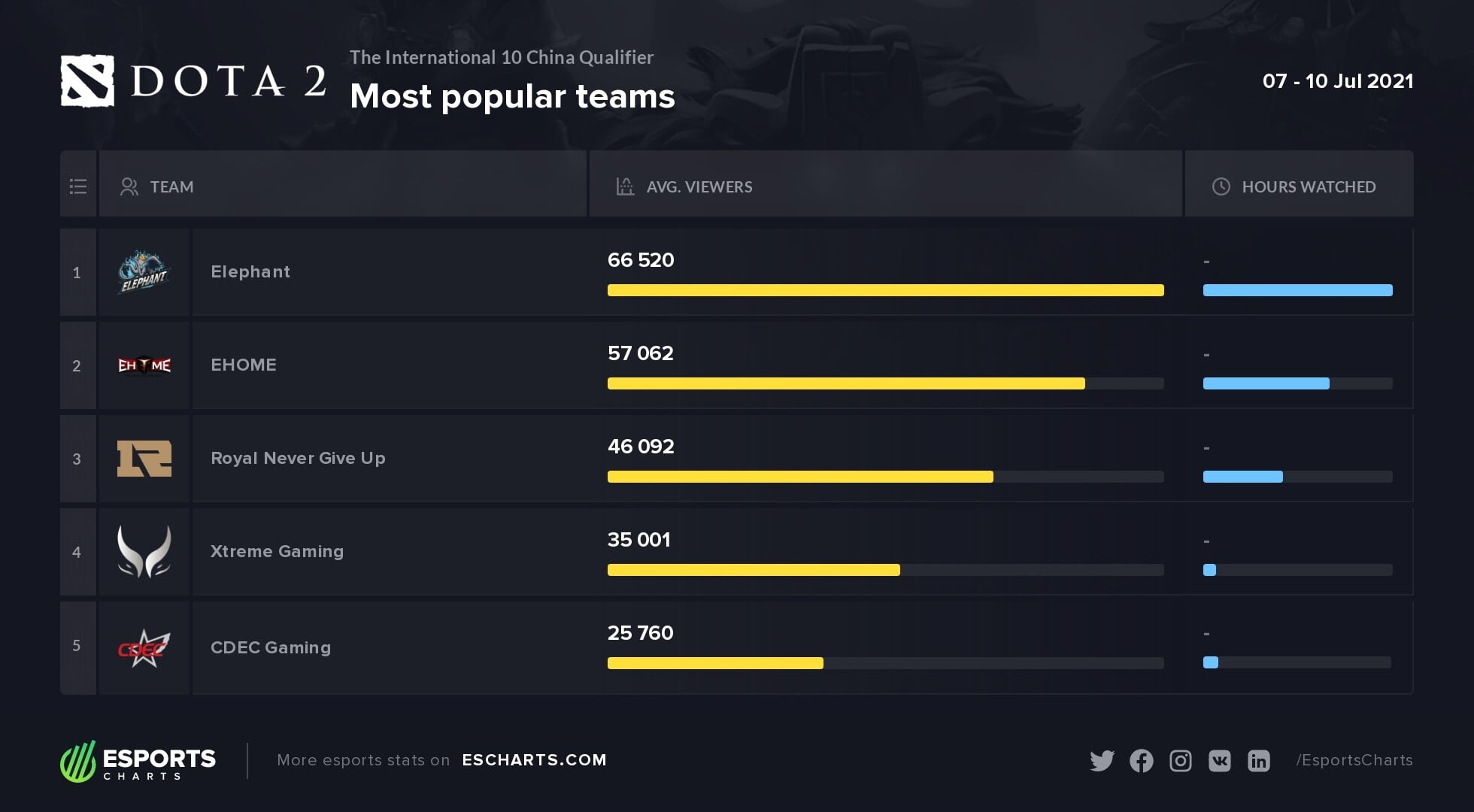 За матчами команды в среднем следили 66,5 тысяч зрителей. На второй строчке расположилась EHOME – 57 тысяч. Тройку лидеров замкнула RNG – 46 тысяч зрителей.