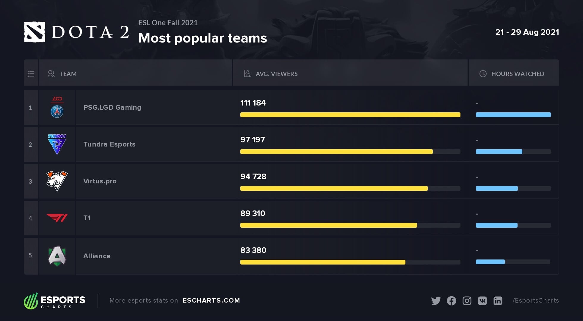 PSG.LGD стала самой популярной командой на прошедшем турнире ESL One Fall 2021 по среднему количеству зрителей.