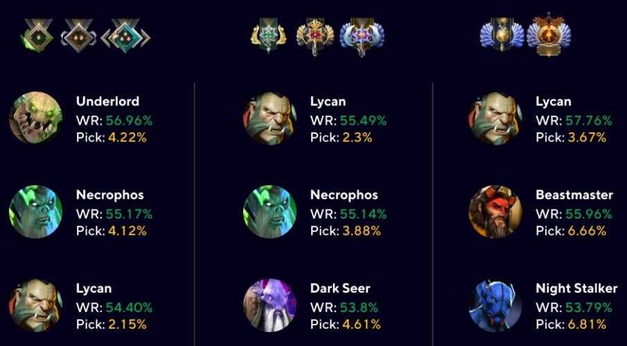 В свою очередь, самым успешным офлейнером на низких рангах является Underlord – 56,96% побед.