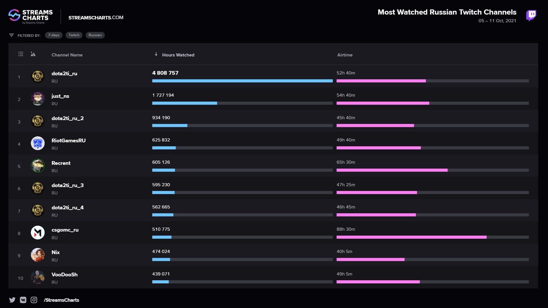 Сайт Streams Charts опубликовал статистику самых просматриваемых русскоязычных каналов на Twitch за неделю с 5 по 11 октября.