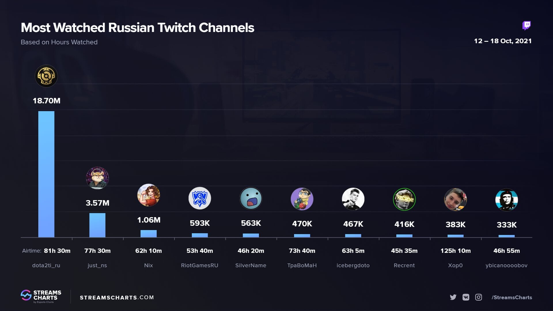Больше всего часов просмотра набрала официальная трансляция The International 10 – 18,70 млн. В топ-3 также попали каналы Ярослава «NS» Кузнецова (3,57 млн) и Александра «Nix» Левина (1,06 млн).