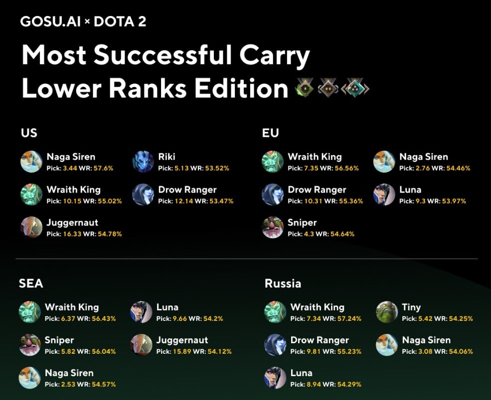 Wraith King, Drow Ranger и Luna – самые успешные керри на низких рейтингах в России