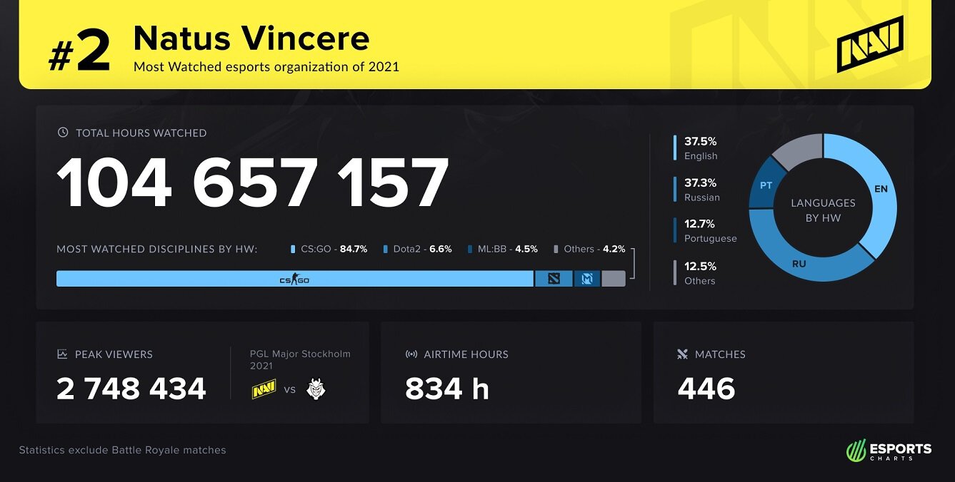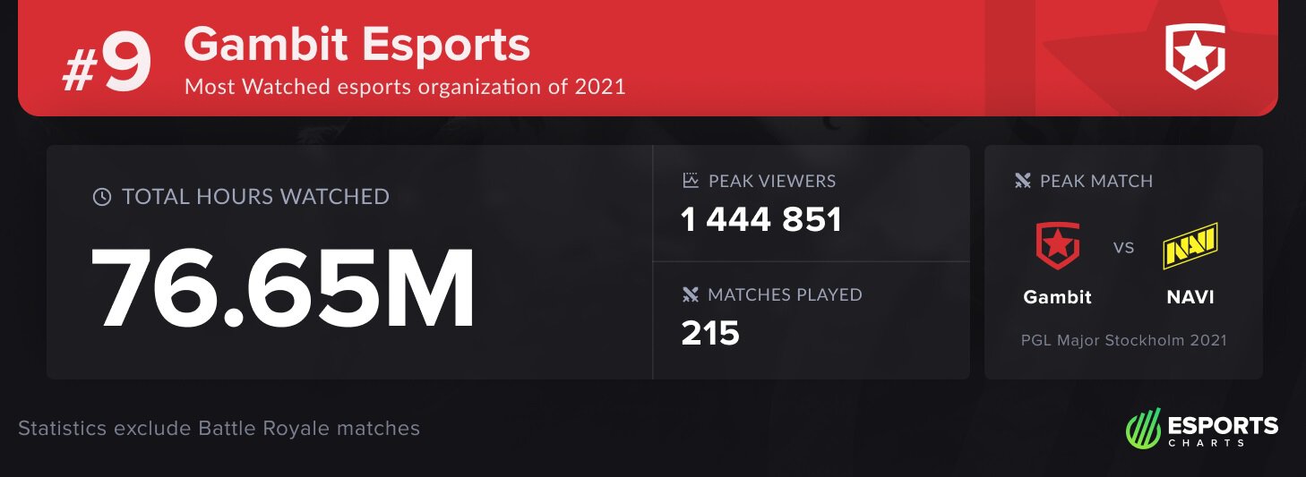 Большую часть просмотров для NAVI принес состав по CS:GO. Фанаты Gambit следили в основном за ростерами по CS:GO и Valorant.