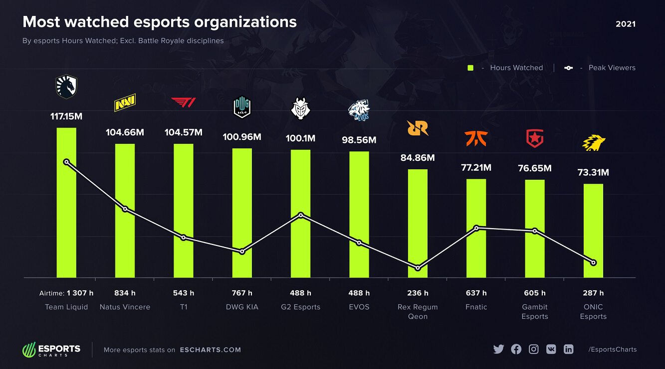 Список составили по часам просмотра матчей клубов. Возглавила рейтинг Liquid (117,1 млн часов), а помимо NAVI (104,6 млн), в топ также попала Gambit (9-е место, 73,31 млн).