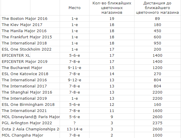 Для исследования реддитор собрал выступления OG на ланах и нашел информацию о количестве цветочных магазинов рядом с местом проведения.
