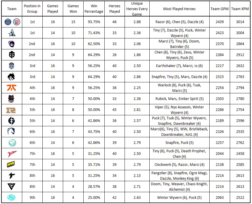 Самое большое число уникальных героев за время групповой стадии Arlington Major пикнула PSG.LGD – 46 героев в 16 матчах. Китайская команда чаще всего пикала Разора (6), Чена (5) и Даззла (4).