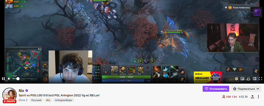 13 августа за трансляцией матча Spirit – PSG.LGD на канале Александра следило больше 100 тысяч зрителей.