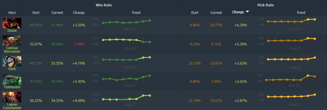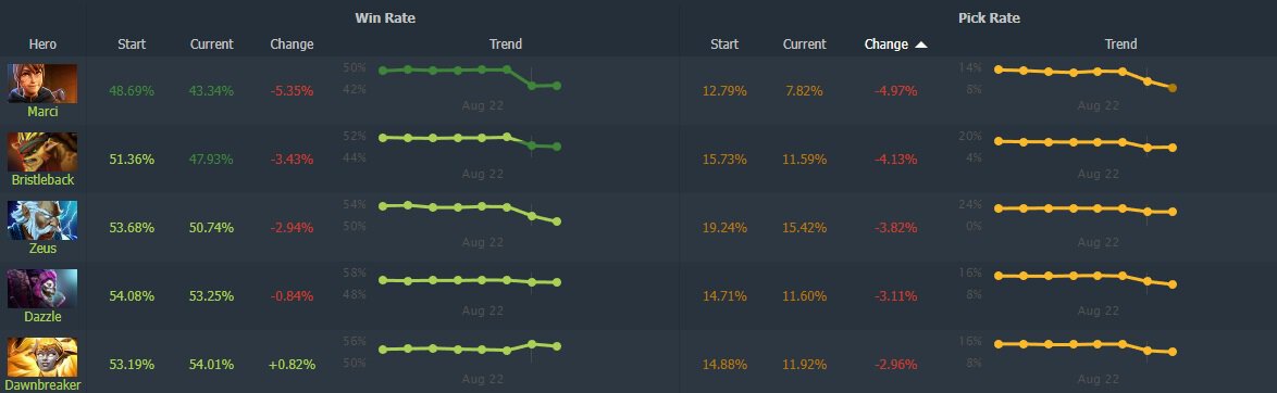 Частота выбора первого выросла на 6,30%, второго – на 5,39%. Также в топ-3 по прибавке к пикрейту попал Slark (3,62%). Гораздо реже игроки стали брать Марси, Бристлбэка и Зевса.