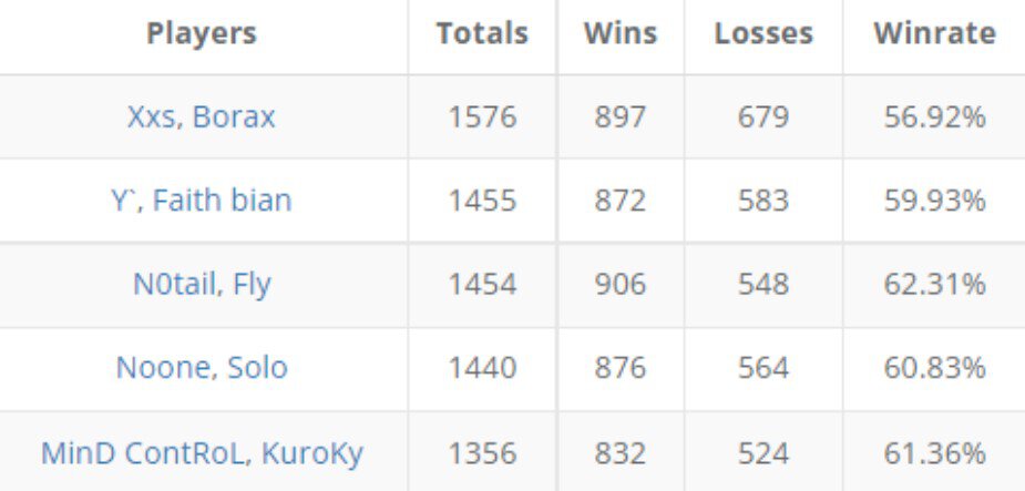 На первом месте расположились игроки Aster – Лин «Xxs» Дзин и Е «Borax» Чжибяо. У них 1576 совместных матча на про-сцене.