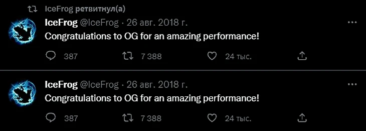 Icefrog также поздравлял OG с чемпионствами на TI8 и TI9 – в 2019 году он это сделал с помощью ретвита прошлой публикации.