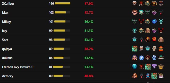 За последние 8 дней Xcalibur завершал рейтинговые матчи 146 раз – это чуть больше, чем 18 игр в день. Винрейт киберспортсмена составил 47,6%, сейчас у Икскалибура 230-й ранг в европейском рейтинговом ладдере.