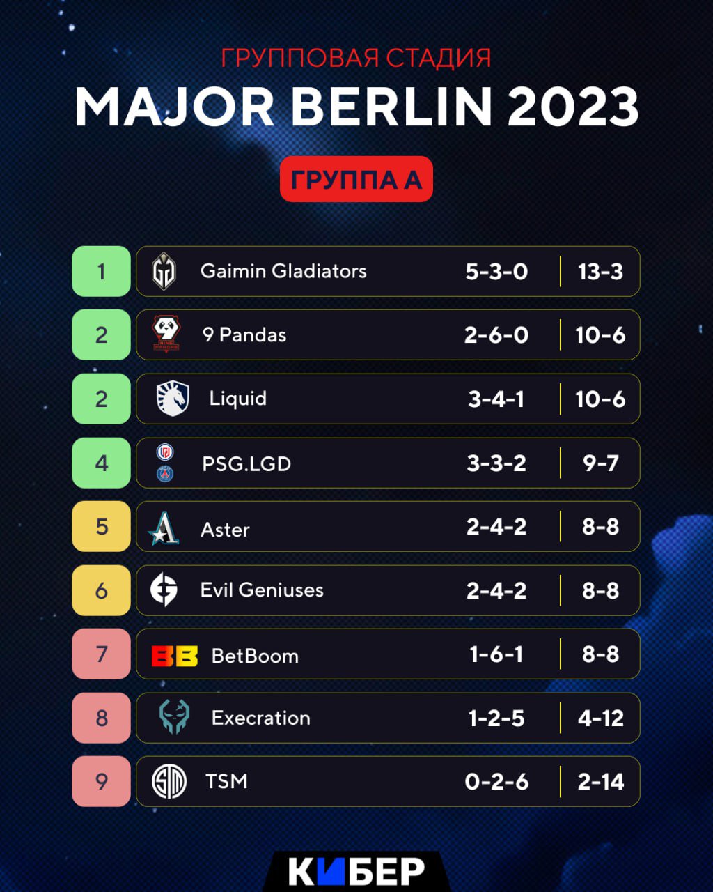 Группа А: BetBoom, Evil Geniuses, Gladiators, 9Pandas, PSG.LGD, Aster, Liquid, Execration, TSM.