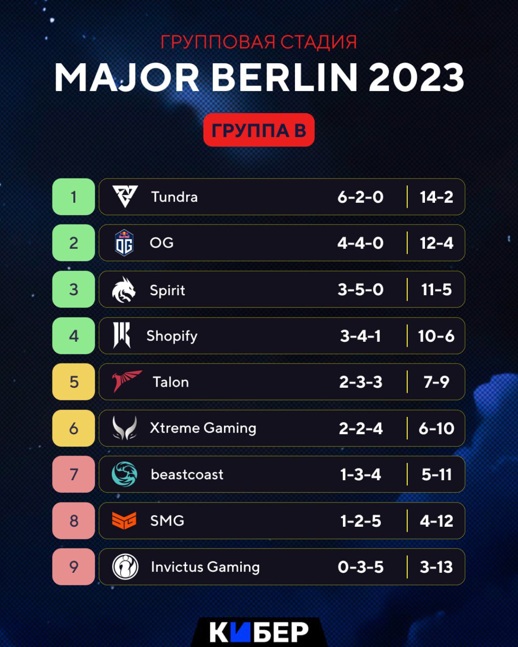 Группа Б: OG, Shopify Rebellion, Tundra, Beastcoast, Spirit, Talon, SMG, Invictus Gaming, Xtreme.