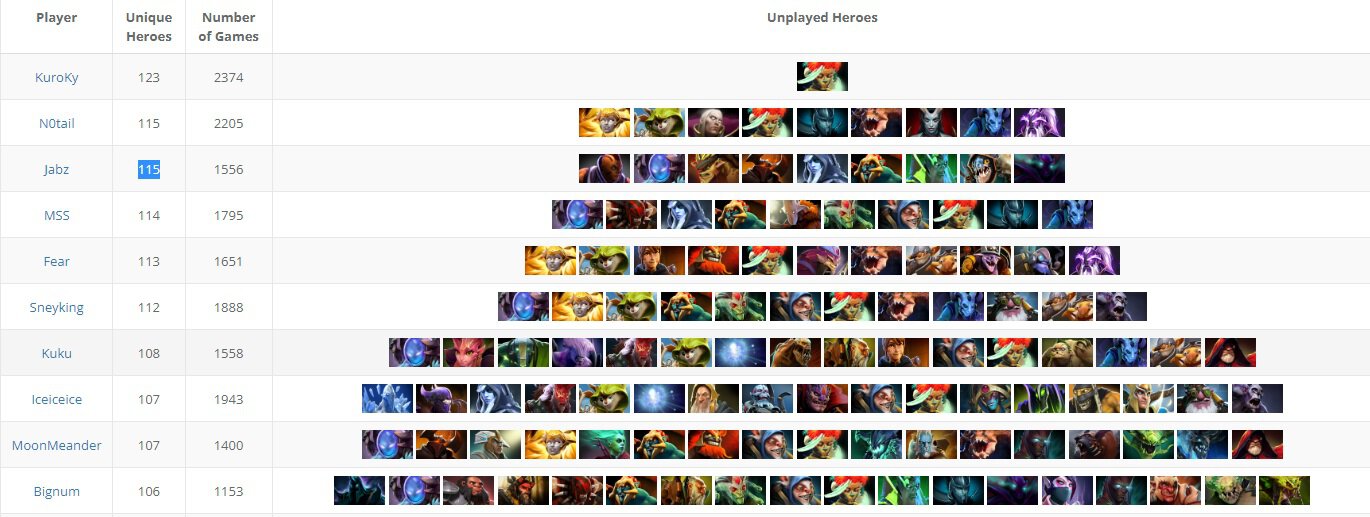 Оффлейнер Talon Ануча «Jabz» Джиравонг сыграл на 115 из 124 героях в профессиональных матчах.