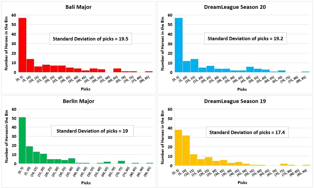 На реддите выложили распределение пиков на разных турнирах, которое показывает, что пикается все меньше и меньше героев