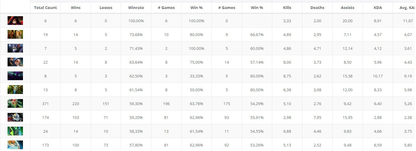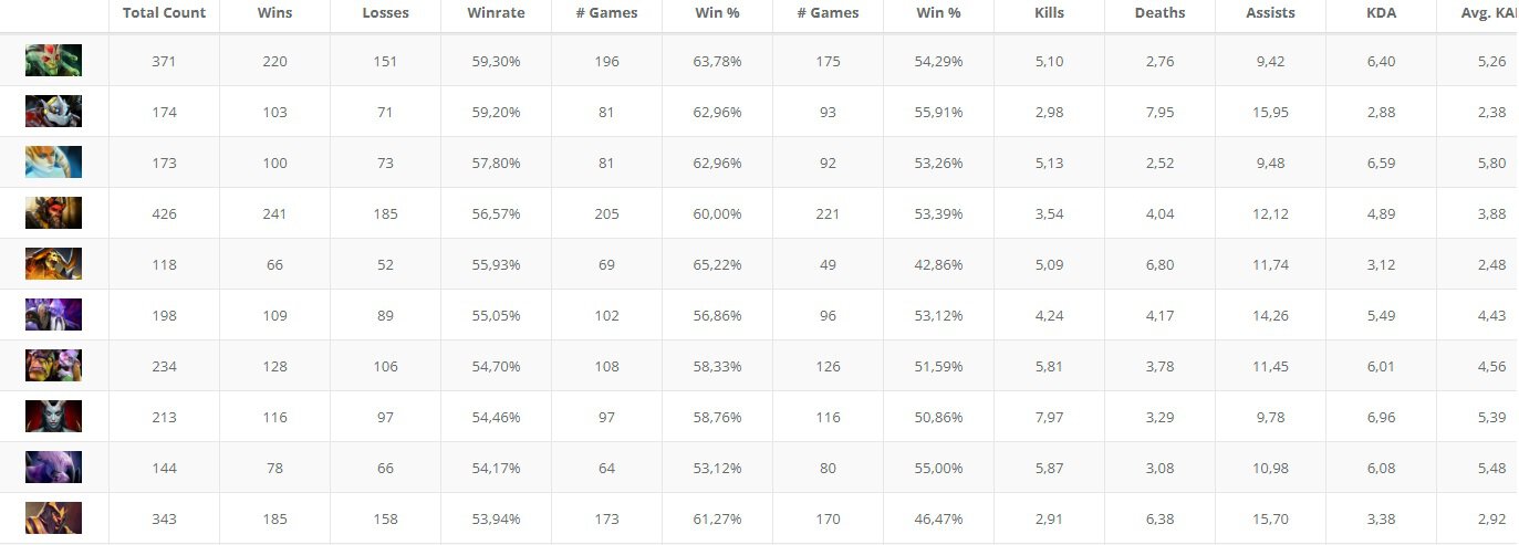 Также в топе присутствует Clockwerk – 59,2% побед за 174 игры и Naga Siren – со 100 победами за 173 игры.
