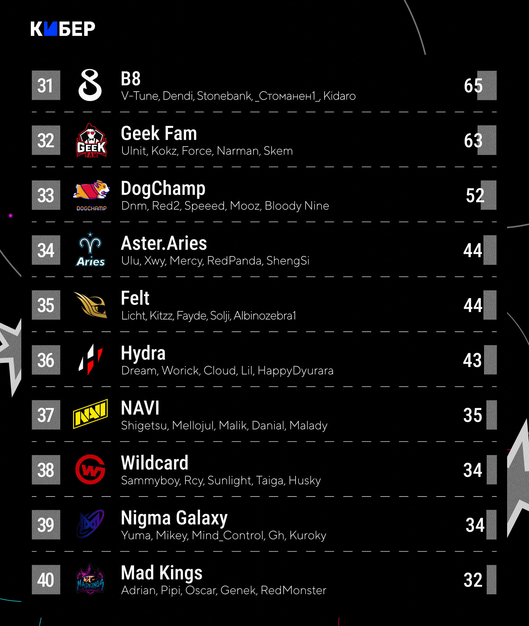 У рейтинга Кибера полностью открытая система (мы подробно объясняем ее в посте под табличками): все турниры разделены на категории, за турнир каждой категории дается определенное количество очков, со временем они сгорают по продуманному алгоритму.