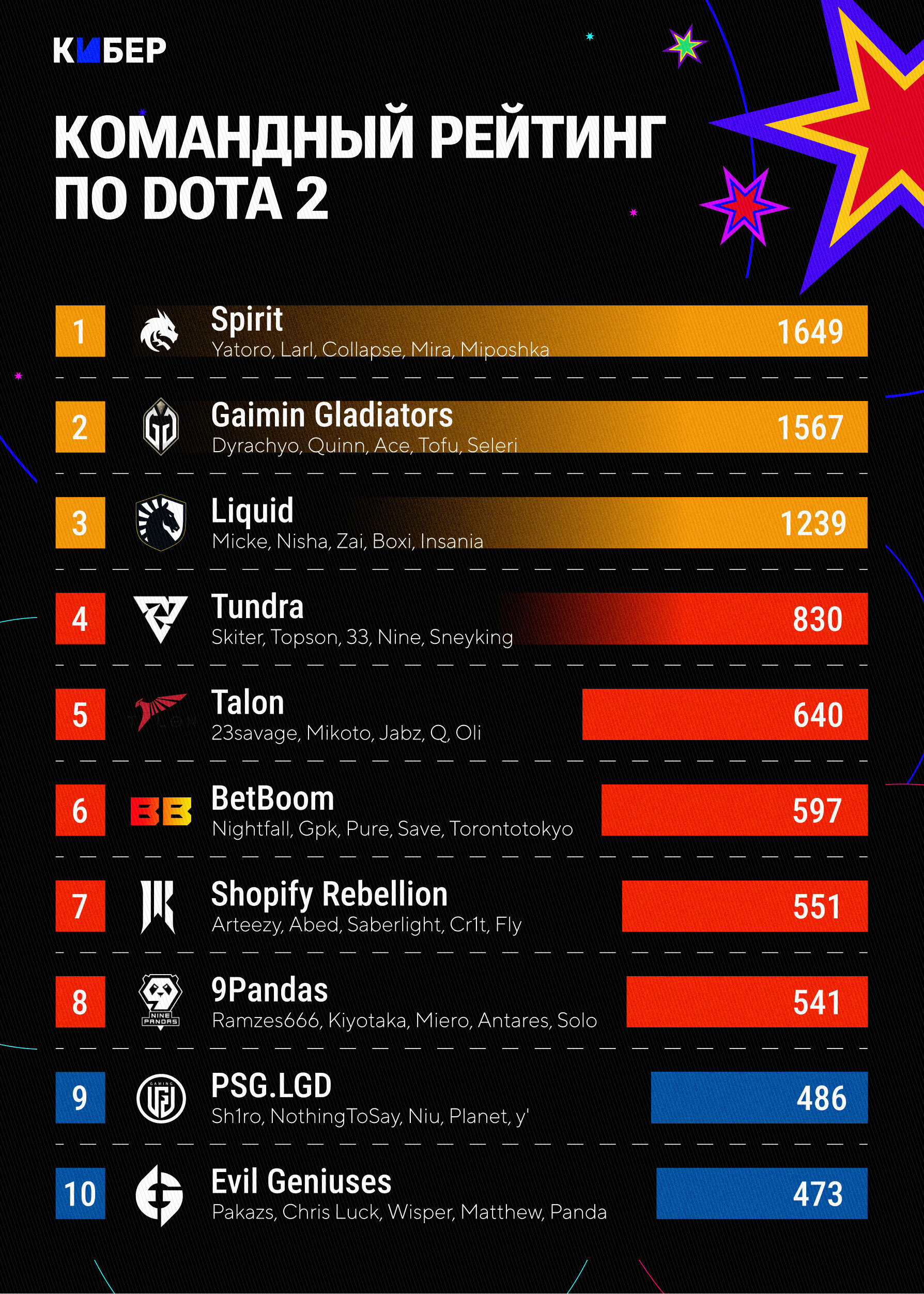 Кибер выпустил рейтинг команд Доты со Spirit на первом месте.