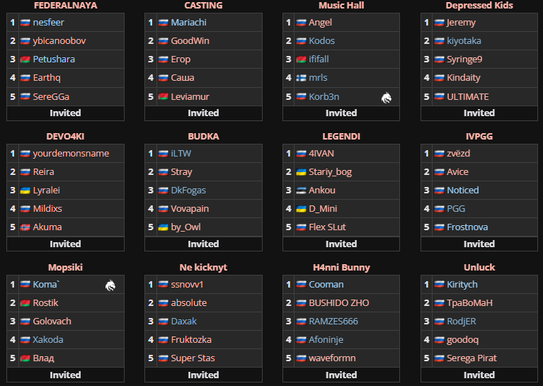 Состав участников: Mopsiki, Federalnaya, Legendi, IVPGG, Devo4ki, Music Hall, Casting, Budka, Depressed Kids, Ne kicknyt, H4nni Bunny, Unluck.