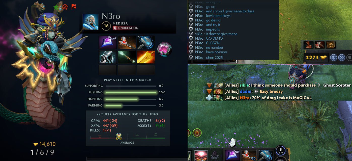 «70% of dmg i take is MAGICAL» — урон-то бывает магический, как и способность обучаться этому игроку, но этот весь урон Dota Plus показывает после исчезновения щита, от чего значения могут быть что-то вроде «Medusa получила 15 урона от Laguna Blade», Чел даже не удосуживается открывать сводку смерти, чтобы это увидеть. Не говоря уже о том, что ни один резист на Дузе не работает вообще, пока щит есть».