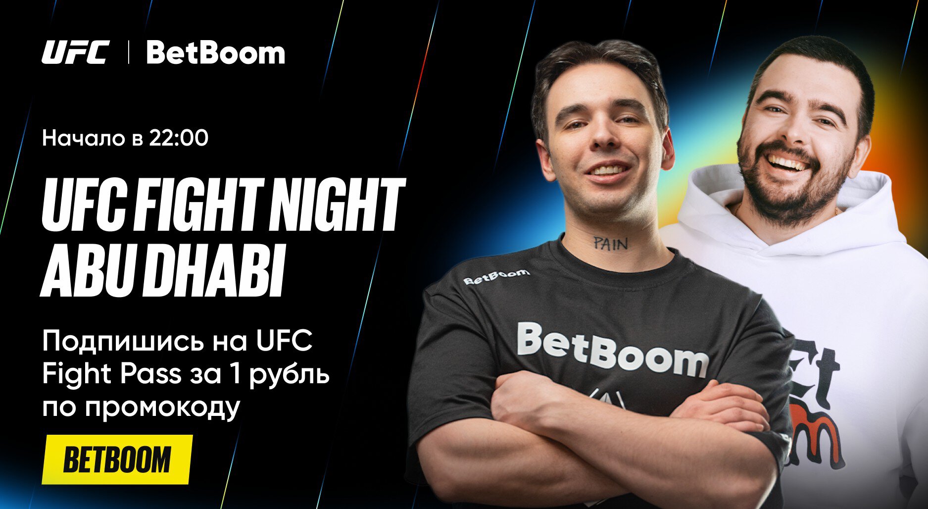 Олег «Stray228» Бочаров и Владимир «Vovapain» Толмачев, амбассадоры букмекерской компании BetBoom, проведут эксклюзивный каст мейнкарда UFC Fight Night Abu Dhabi на официальной трансляции UFC Fight Pass.
