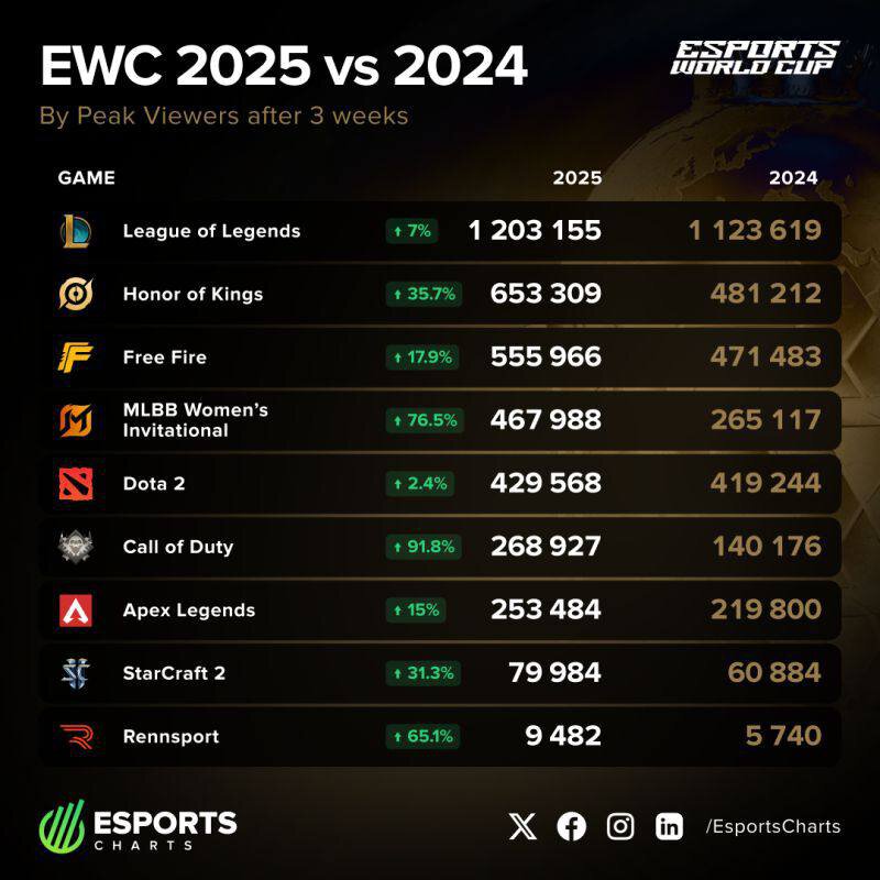 Сразу несколько дисциплин получили прирост зрителей на Esports World Cup 2025.