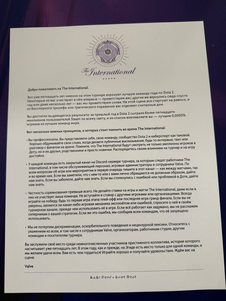 Valve составила одно письмо для всех команд-участниц The International. Для BetBoom Team его написали на русском языке.