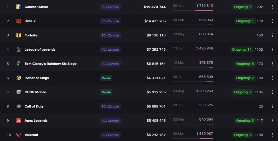 Дота и CS 2 лидируют по разыгранным призовым в 2025 году. Лига Легенд – 4-я