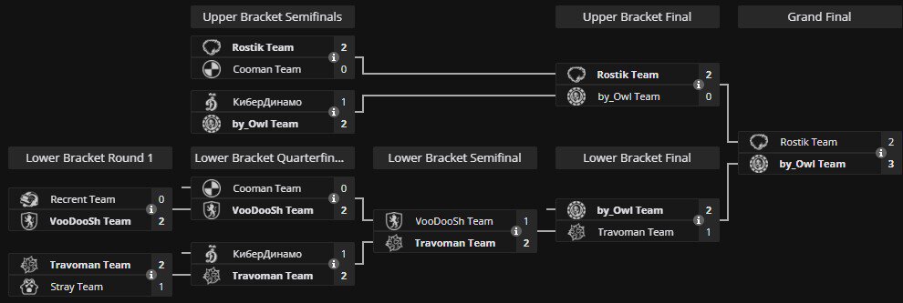 Плей-офф: «КиберДинамо» (YBN Team), Rostik Team, By_owl Team, Cooman Team, Recrent Team, Voodoosh Team, Травоман Team, Stray Team.