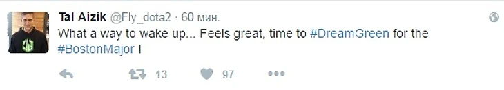 Fly: «Что за способ проснуться... Отличное чувство, время для #DreamGreen на #BostonMajor»