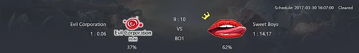 Комментатор «Хайп Студии» Антон «23december» Липнитц сделал обзор матча, отметив странное поведение игроков при счете 9:9, а также заявил о ставке пользователя eriiiiiii, которая составила 14 176 долларов внутриигровыми предметами на первые десять убийств командой Sweet Boys. В случае победы он бы получил предметов на сумму около 200 000 долларов. Стоит заметить, что сайт vpgame.com не показывает, на какую именно команду поставил пользователь. В случае, если бы он поставил на Evil Corporation, он бы выиграл около 850 долларов.