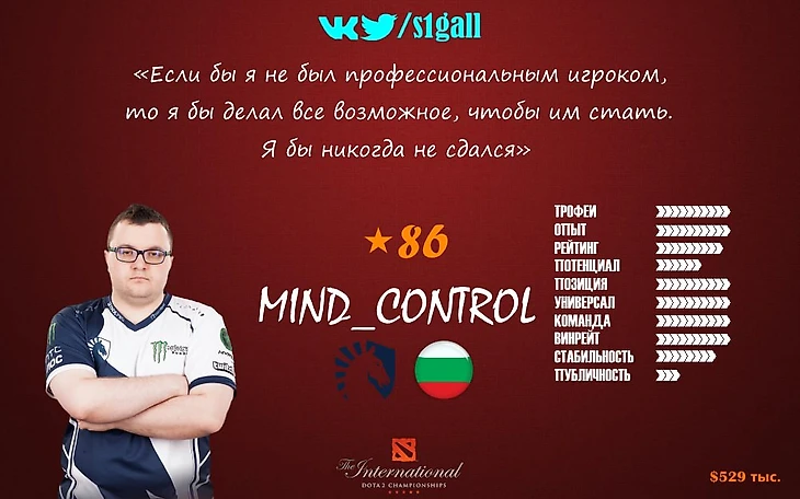 Если кто-то и сможет затмить славу UNiVeRSe с годами, так это болгарский хардлайнер Team Liquid. Он отлично дополняет трио игроков основы европейского гранда и является самым стабильным звеном команды. Медийной составляющей MinD_ContRoL уделяет мало времени, поэтому зачастую вся слава достается его партнерам Miracle и MATUMBAMAN, но заслуг Ивана от этого не отнять.