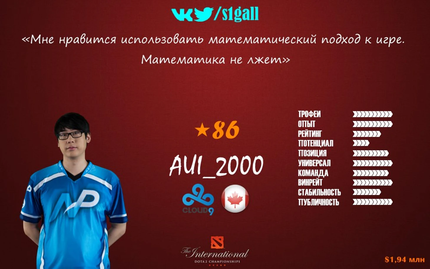 Aui_2000 – один из тех игроков, за кем крайне интересно наблюдать во время игры. Он постоянно экспериментирует, придумывает новые сборки, выбирает необычные решения. Хоть он частенько находится в тени, он посетил ненамного меньше турниров, чем Puppey или UNiVeRSe, и, если забыли, становился чемпионом мира. Его команда одна из самых недооцененных на этом чемпионате мира.